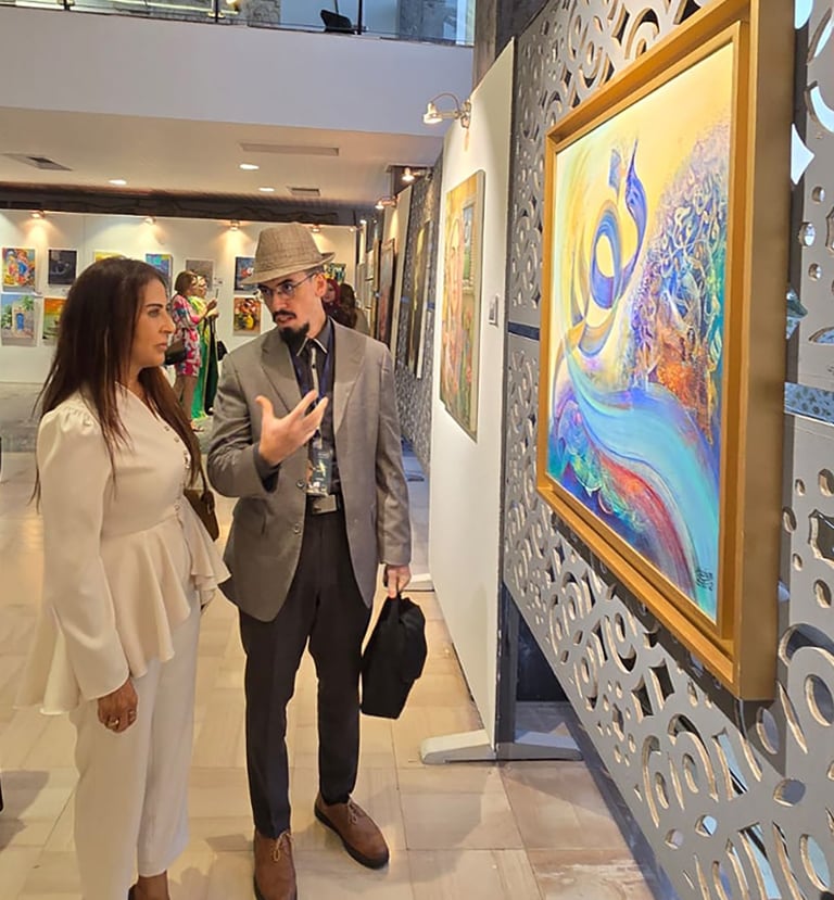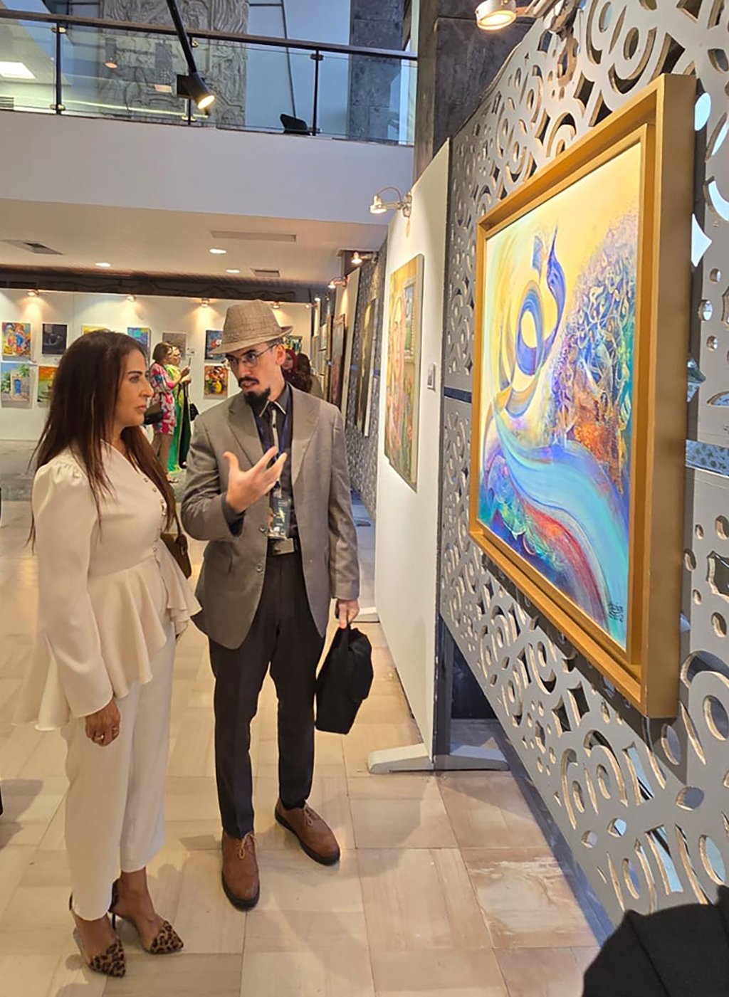 Lors de la visite de Son Excellence l’Ambassadrice du Royaume hachémite de Jordanie à la salle d’exposition, l’artiste Hachem Amzil lui a présenté son œuvre intitulée « Manifestation of the Light ». Ce moment chaleureux a reflété l’estime mutuelle entre les artistes et les représentants culturels, soulignant le rôle de l’art comme pont entre les nations et vecteur d’un dialogue universel.